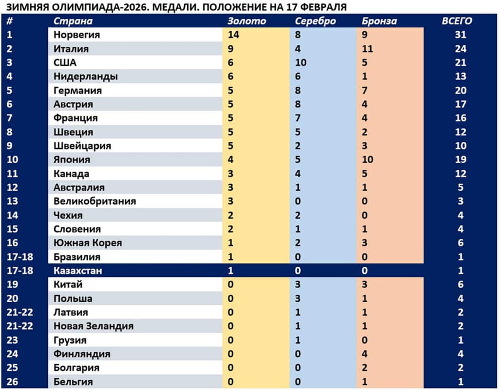 В 11-й соревновательный день Олимпиады-2026 было разыграно шесть комплектов медалей. В бобслее-двойке весь пьедестал заняли немцы. Японки Ами Накаи и Каори Сакамото лидируют после короткой программы фигуристок.