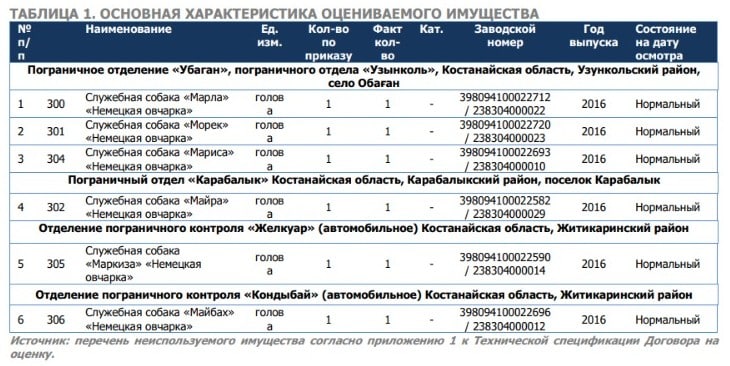 Как указано на сайте электронных торгов, собаки находятся на балансе департамента пограничной службы КНБ по Костанайской области.