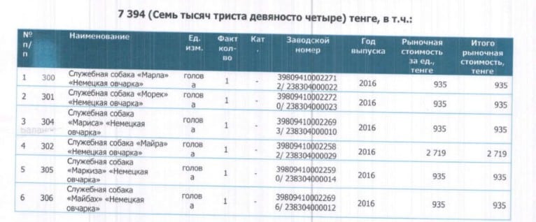Большинство животных продают по 935 тенге. Лишь немецкую овчарку «Майру» выставили за 2 719 тенге, при этом в приложенных документах не объясняется повышенная цена на животное.