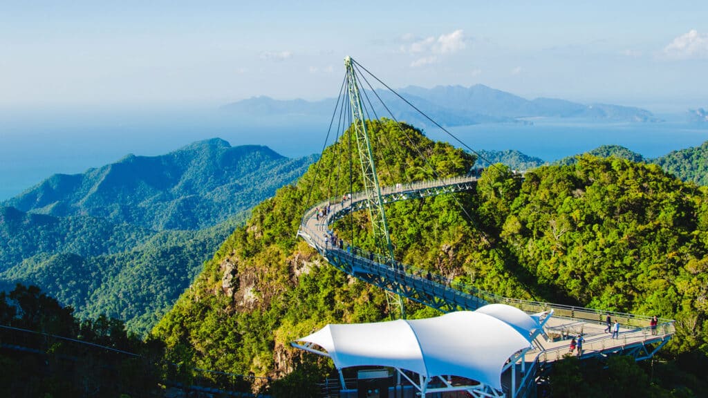 У вершины горы Gunung Mat Cincang, куда можно подняться на канатной дороге, расположен знаменитый изогнутый подвесной мост Sky Bridge. С него открывается панорама джунглей, островков и Андаманского моря. Отличное место для впечатляющих фото.
