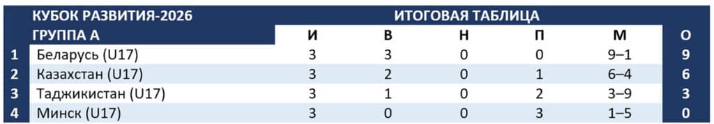 Юношеская (до 17 лет) сборная Казахстана, со счетом 3:1 победив таджикских сверстников, заняла второе место в группе А международного турнира, проходящего в Минске. В понедельник, 23 февраля, наши парни поспорят с командой Узбекистана за бронзовые медали Кубка развития.