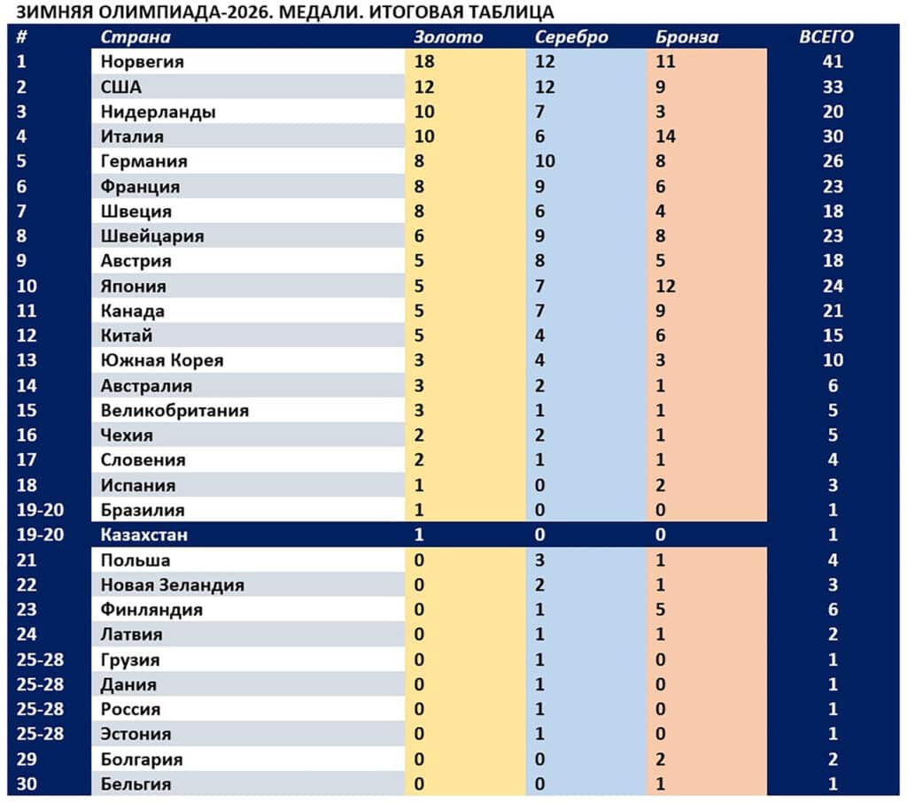 Неофициальный медальный зачет с огромным отрывом выиграла Норвегия. В топ-3 вошли США и Нидерланды. Итальянцам, с блеском выступившим на домашней Олимпиаде, до третьего места не хватило одного золота или серебра.