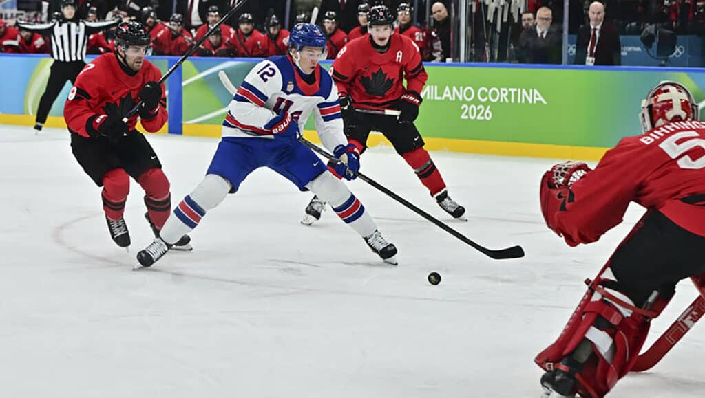 Момент финального матча хоккейного турнира Олимпиады-2026. В атаке будущие победители американцы / Фото: olympics.com