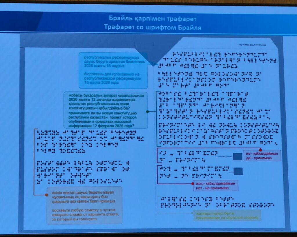 Текст продублирован на казахском и русском языках и выполнен рельефно-точеным шрифтом Брайля для избирателей с нарушением зрения.