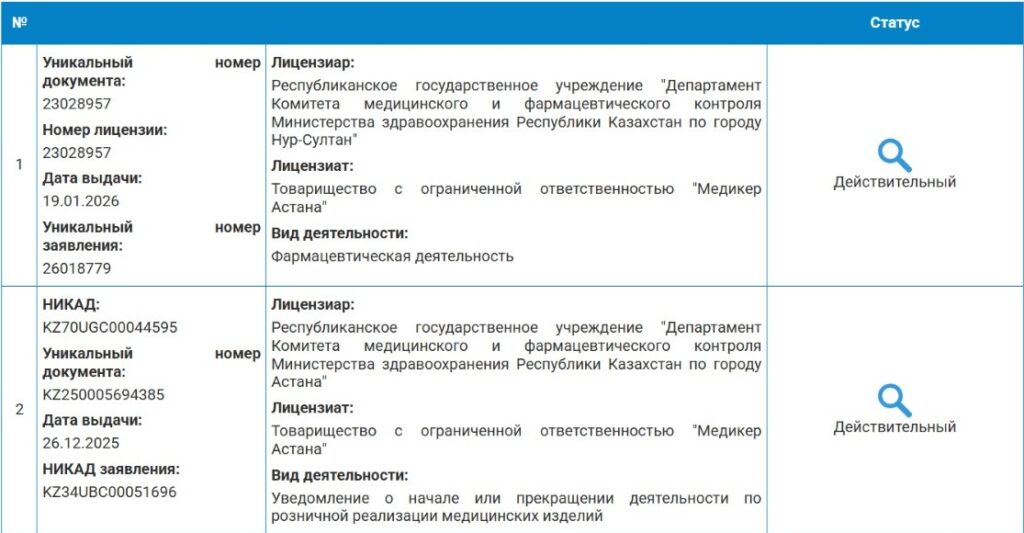 Если лицензию по указанному БИН найти не удается, это означает, что разрешительный документ не выдавался Минздравом, и казахстанцы могут обратиться в территориальные департаменты Комитета.