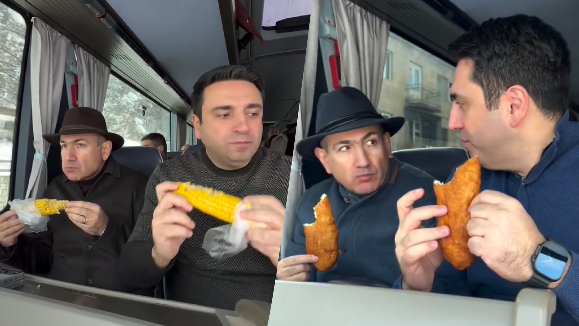 На кадрах, опубликованных в его Instagram, глава правительства едет в автобусе вместе с соратниками и перекусывает по-простому. Сначала румяным пирожком, затем – вареной кукурузой.