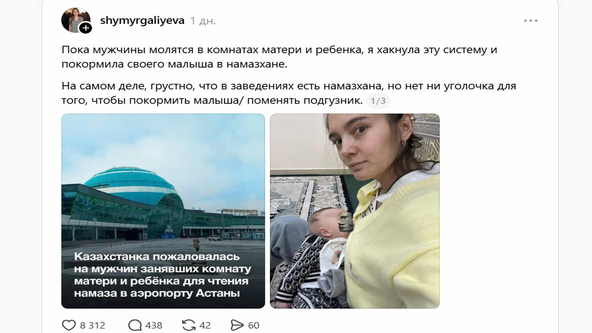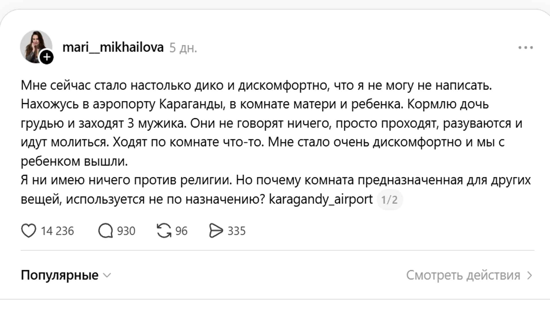Параллельно с этим в Казнете обсуждают обратную ситуацию. Пользовательница Марина Михайлова рассказала о неприятном инциденте в аэропорту Караганды. Находясь в комнате матери и ребенка во время грудного вскармливания, она столкнулась с тремя мужчинами, которые зашли в помещение, разулись и начали совершать намаз.