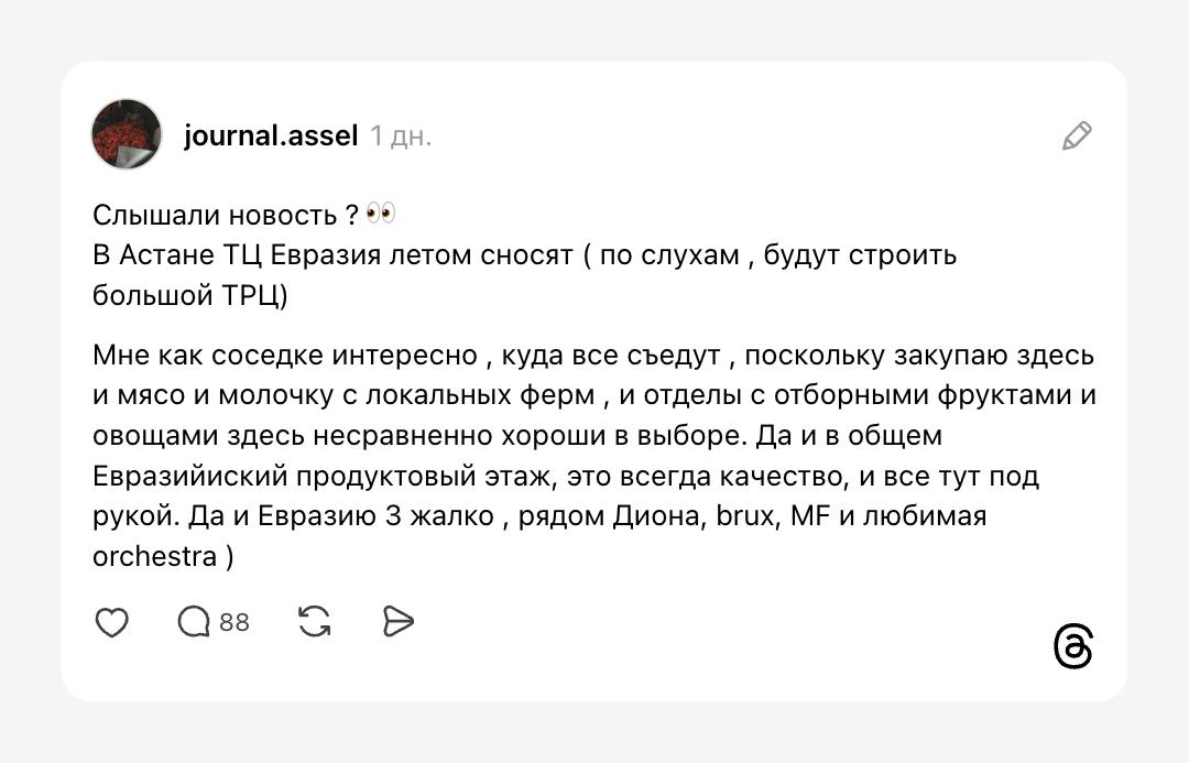 В соцсетях появились слухи о том, что летом 2026 года ТЦ «Евразия» может быть снесен. Это обеспокоило покупателей, ведь центр работает со времен, когда Астана называлась Целиноградом, а на правом берегу Есиля крупных ТРЦ почти нет.