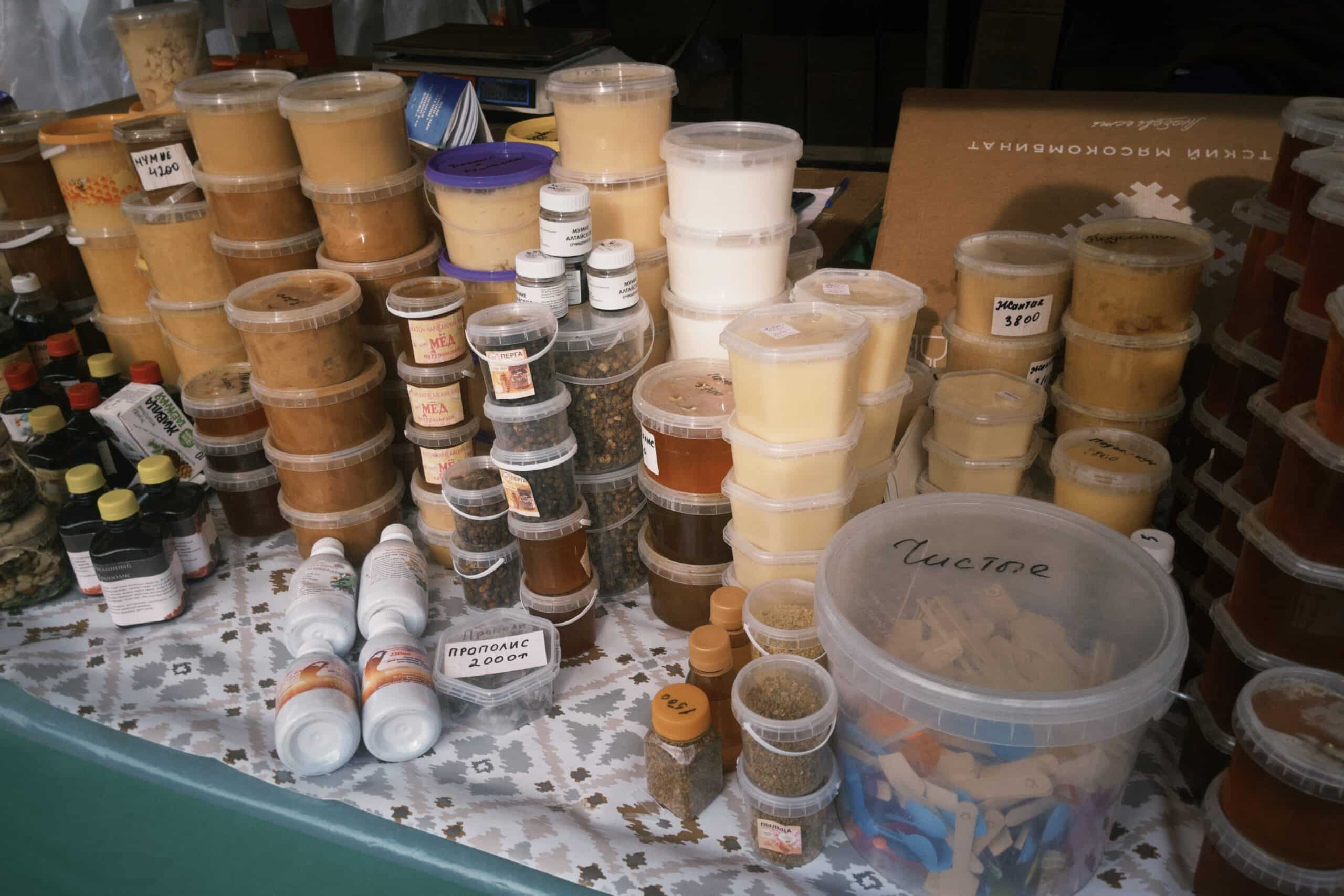 Часто на ярмарках можно встретить мед, в основном его привозят из ВКО. Из плюсов: можно попробовать все, что предлагают. Баночка объемом около 400 мл обойдется в 2 800 тенге, но цены зависят вида и объема тары.