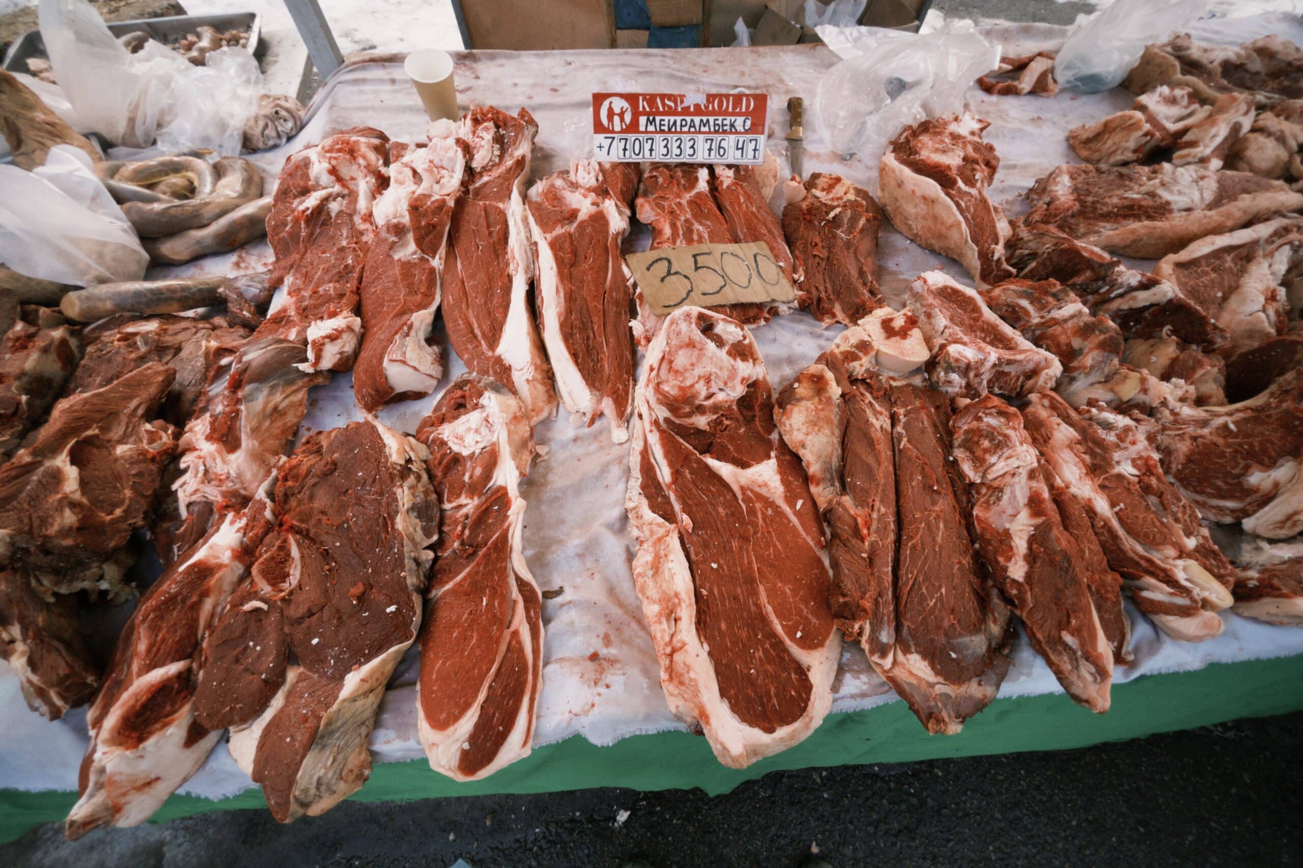Больше всего людей на таких ярмарках, как правило, собирается у палаток с мясом. Например, говядина здесь в среднем стоит около 3 500 тенге за килограмм, в зависимости от части туши, тогда как в магазинах цена может доходить до 4 700 тенге и выше.