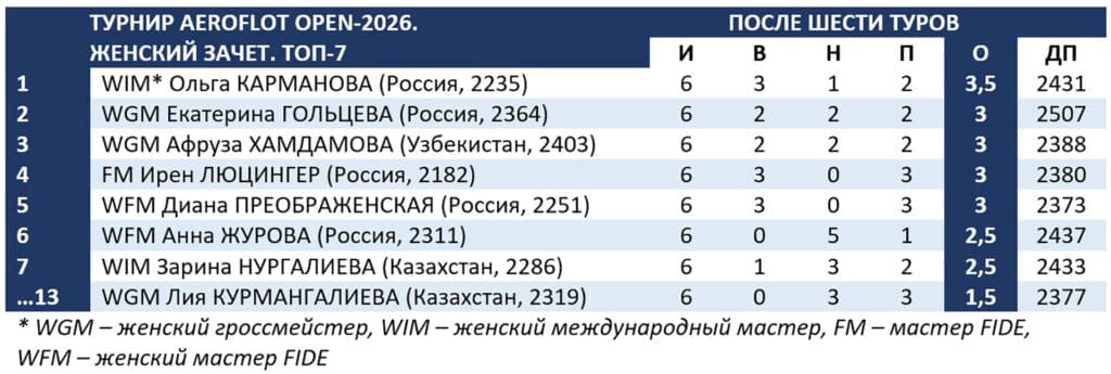 В шестом туре 16-летняя Нургалиева черными проиграла россиянину Александру Тряпишко. Второе фиаско отбросило нашего женского международного мастера с третьего места женского зачета на седьмое. Лия Курмангалиева, сыграв вничью с 14-летним Таймазом Темирбековым из России, поднялась еще на одну ступень. Теперь она 13-я.