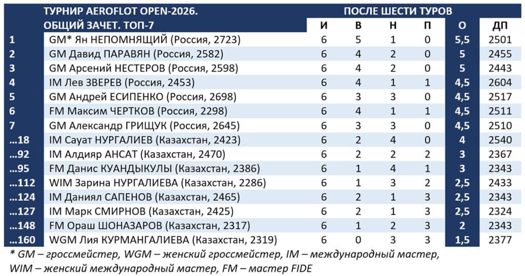 На московском международном турнире Aeroflot Open-2026 осталось сыграть три тура. Казахстанский шахматист Сауат Нургалиев в именитой компании не знает поражений, Зарина Нургалиева идет седьмой в женском зачете.