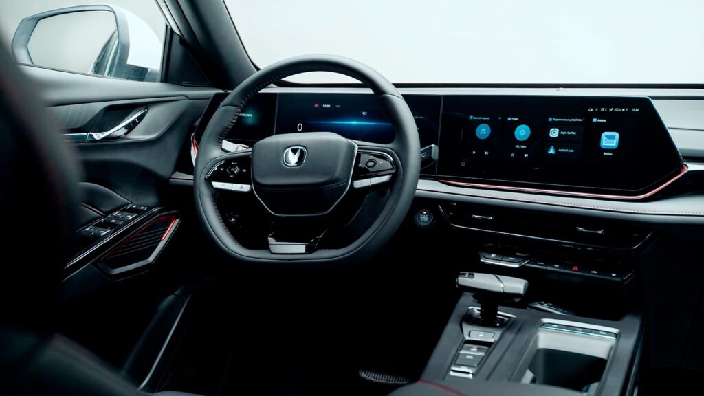 В салоне – экокожа, экраны цифровой приборки и мультимедийной системы (по 12,3 дюйма каждый), обогрев руля и сидений. Также есть панорамная крыша и электропривод багажника.