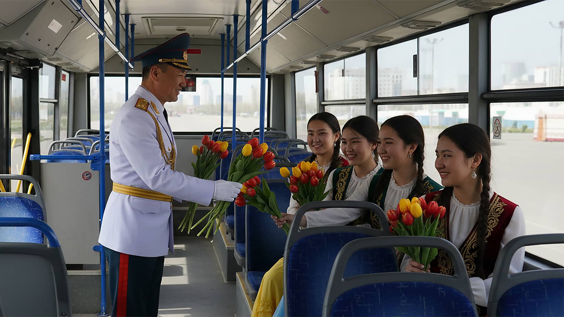 Артисты хора также зашли в городские автобусы разных районов и устраивали мини-концерты прямо посреди рейсов. Не ожидавшие такого сюрприза пассажирки слушали песни «Сұлу қыздар» и «Дарите женщинам цветы». Гвардейцы вручали женщинам тюльпаны и поздравляли с праздником.