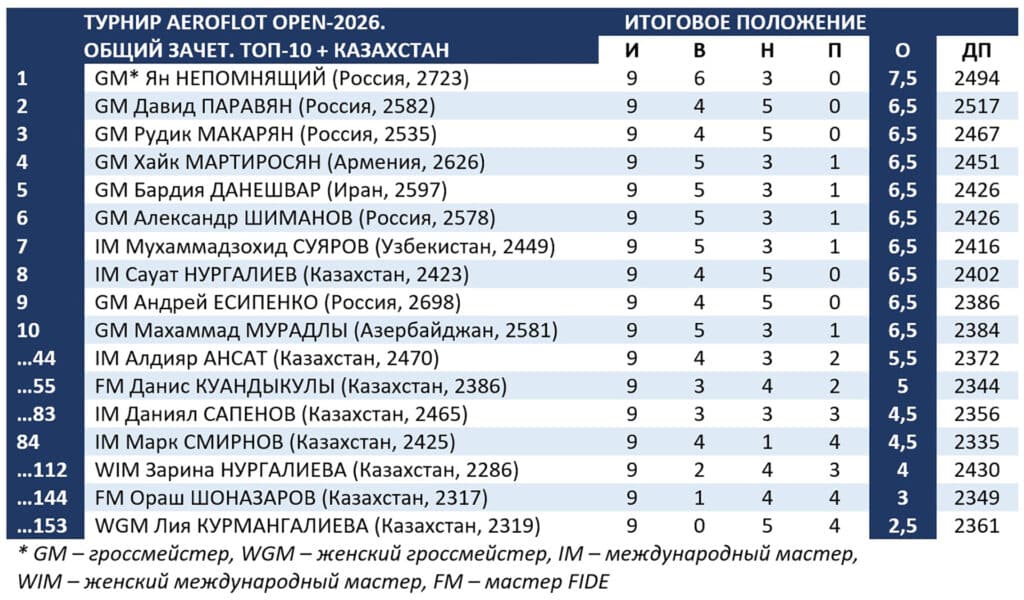 Российский гроссмейстер Ян Непомнящий, набрав 7,5 очка, первенствовал на турнире Aeroflot Open-2026, завершившийся в Москве. Афруза Хамдамова из Узбекистана с пятью баллами выиграла женский зачет.