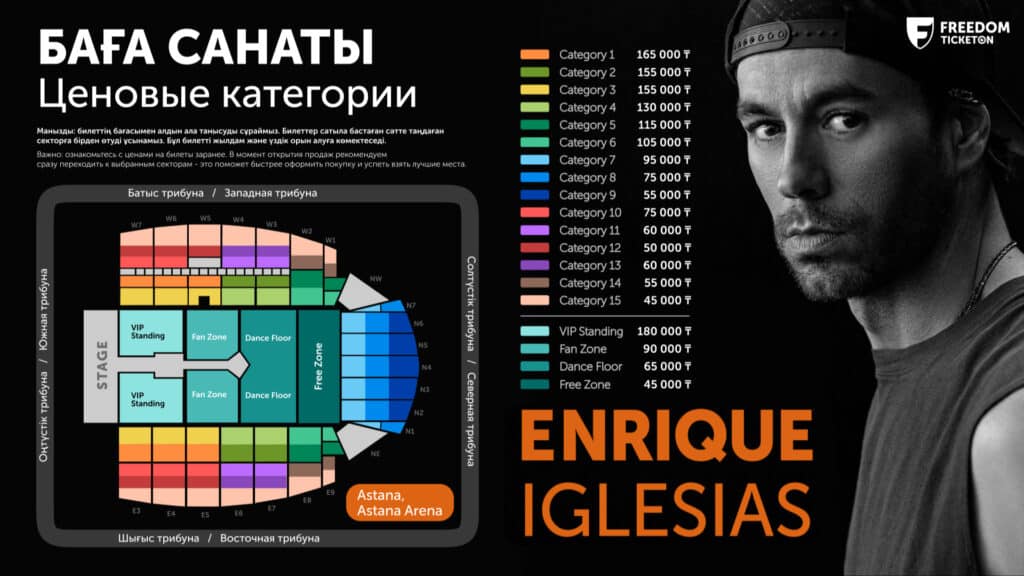 Билеты будут доступны на официальной билетной платформе Freedom Ticketon — ticketon.kz. Эксклюзивная предпродажа для пользователей SuperApp пройдет 7, 8 и 9 марта. Билеты стоят от 45 тыс. тенге в зависимости от места и сектора.