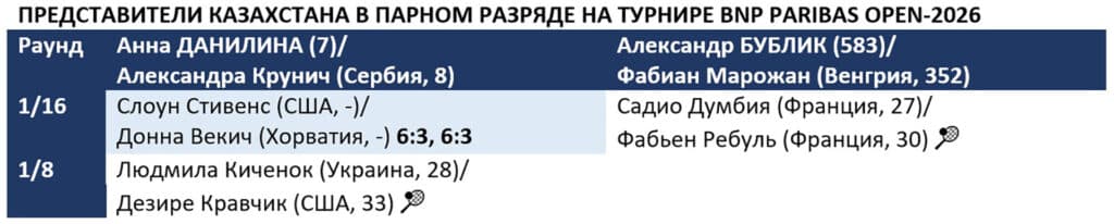 Анна Данилина (7) в паре с Александрой Крунич (8) с победы стартовала на турнире BNP Paribas Open-2026 в США. Казахстанка с сербкой за 69 минут обыграли американско-хорватский дуэт Слоун Стивенс/Донна Векич – 6:3, 6:3. Юлия Путинцева (76) проиграла датчанке Кларе Таусон (17) – 6:7 (9:11), 2:6.