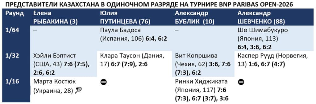 Бублик – третий представитель Казахстана, зачехливший ракетку в Индиан-Уэллсе. Ранее это сделали Юлия Путинцева и Александр Шевченко. Борьбу продолжают Елена Рыбакина, побеждавшая здесь в 2023 году, и Анна Данилина в парном разряде.