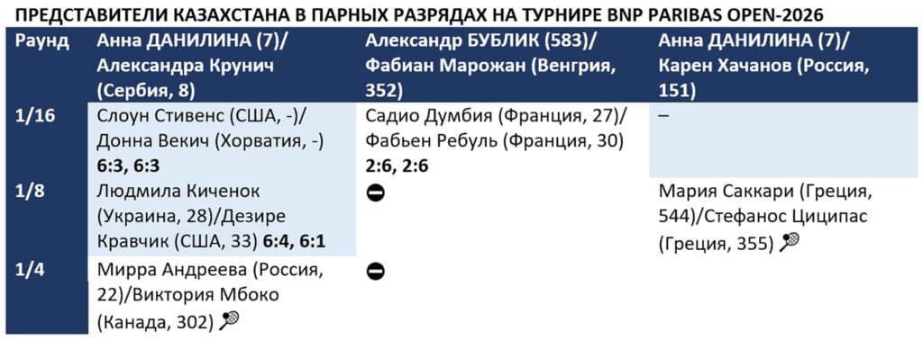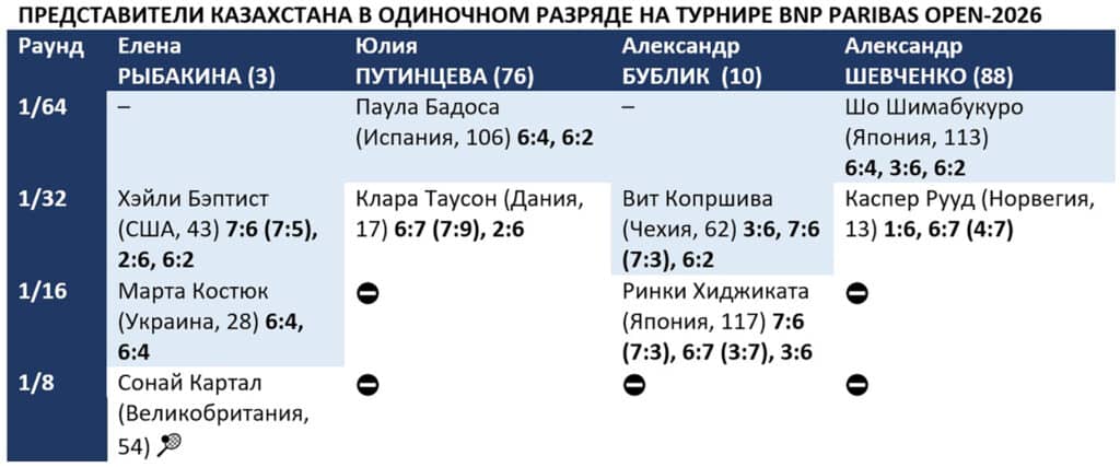 Бублик – третий представитель Казахстана, зачехливший ракетку в Индиан-Уэллсе. Ранее это сделали Юлия Путинцева и Александр Шевченко. Борьбу продолжают Рыбакина, побеждавшая здесь в 2023 году, а также Анна Данилина в парном разряде и миксте.