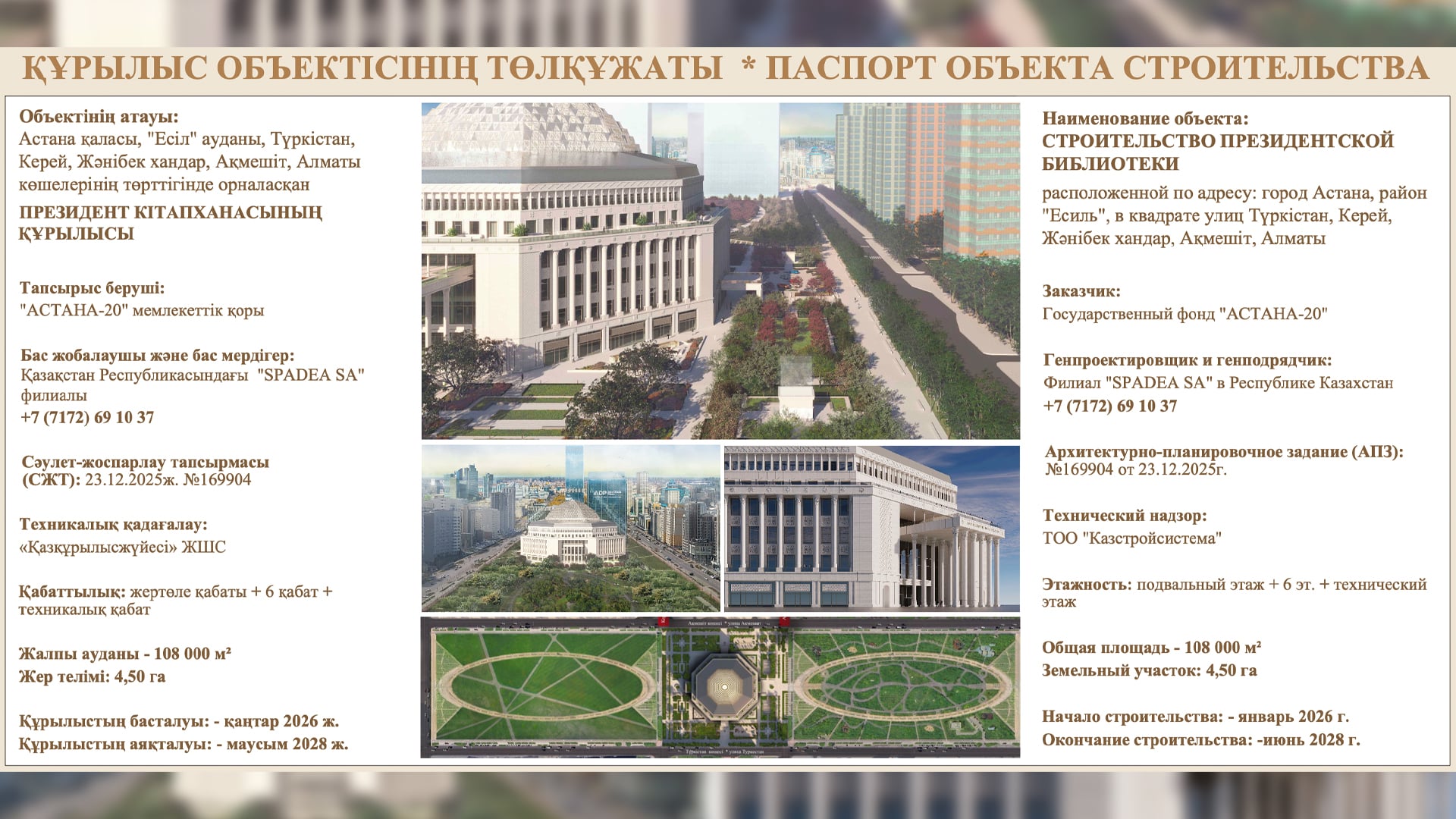 Будущий объект расположится на территории строящегося линейного парка в Астане. Согласно паспорту, библиотека строится по заказу государственного фонда «Астана-20». Работы начали в январе 2026 года.