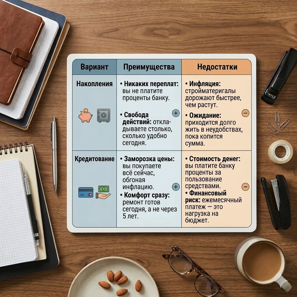Если вам нужен косметический ремонт (обои, ламинат, потолок) и вы планируете уложиться в сумму, которую реально собрать за 6-10 месяцев – лучше не связываться с кредитами. Вы не будете переплачивать проценты и сохраните спокойствие.