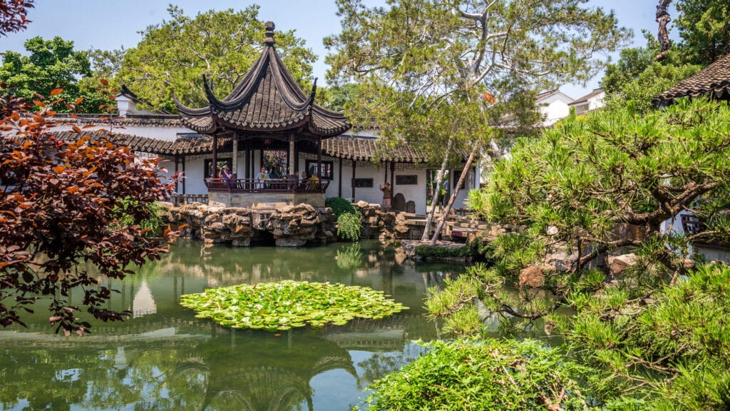 Самый известный сад Сучжоу. Композиция построена вокруг прудов, островков и павильонов.