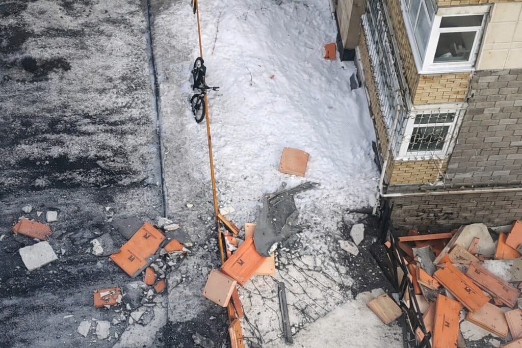 Видео с места происшествия появилось в социальных сетях. На кадрах видны падающие куски облицовки, которые обрушились в том числе и возле детской площадки.