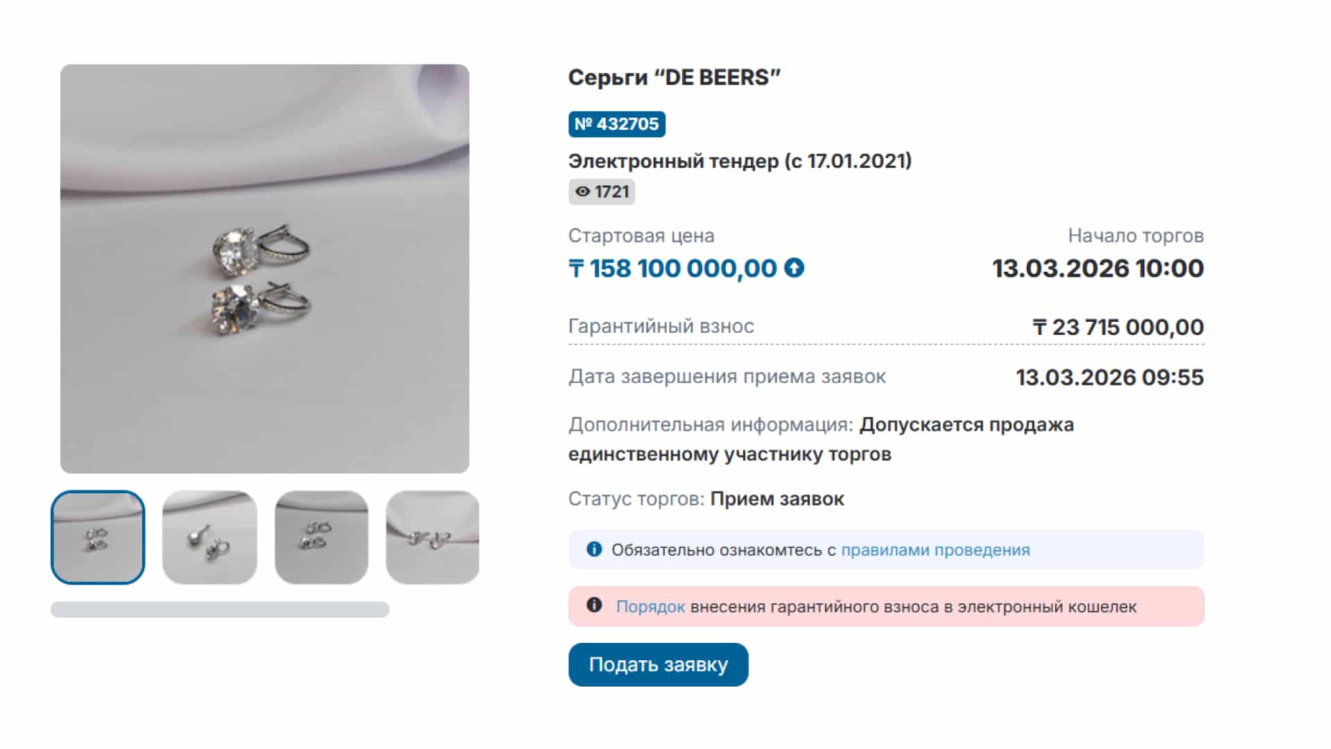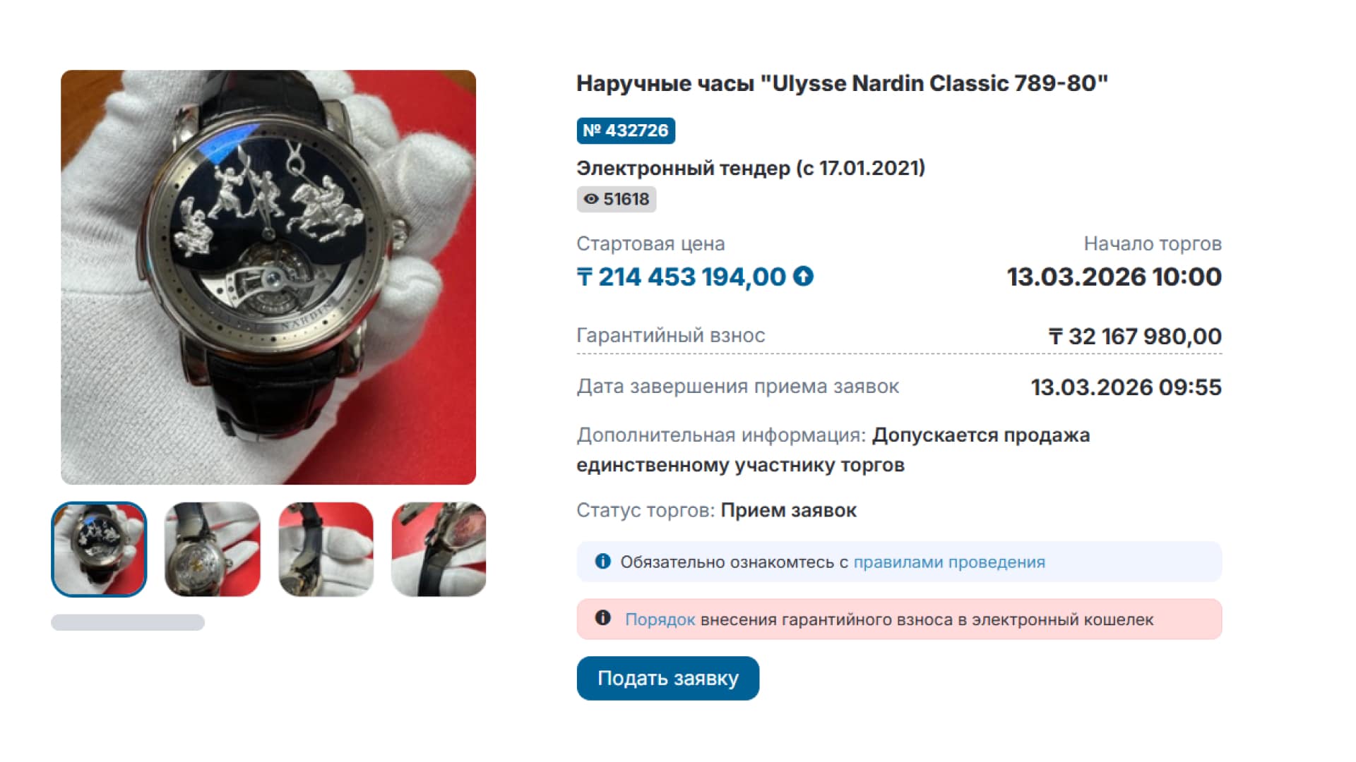 Торги по этим лотам должны начаться 13 марта. Для участия необходимо внести гарантийный взнос: около 32 млн тенге за часы и 23,7 млн тенге за серьги.