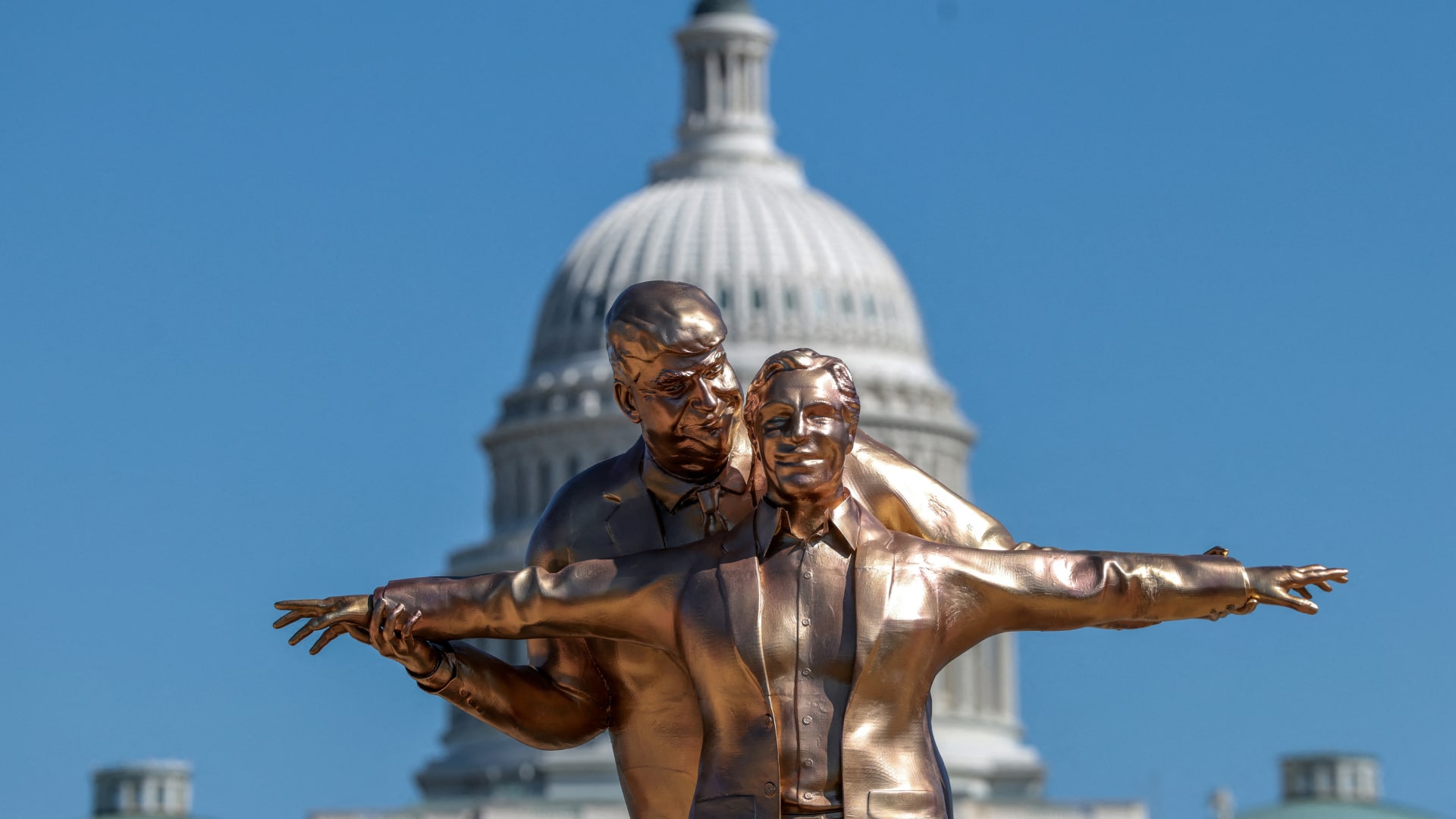 На Национальной аллее в Вашингтоне появилась необычная арт-инсталляция — почти четырехметровая золотая статуя, на которой Дональд Трамп и Джеффри Эпштейн изображены в знаменитой позе из фильма «Титаник».