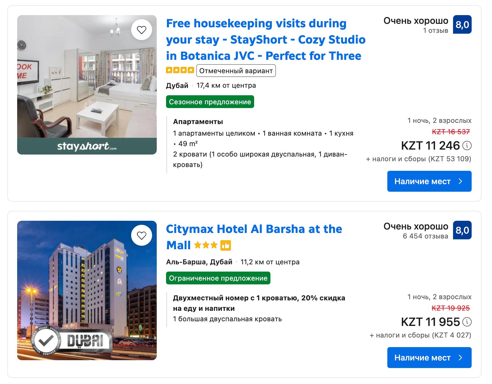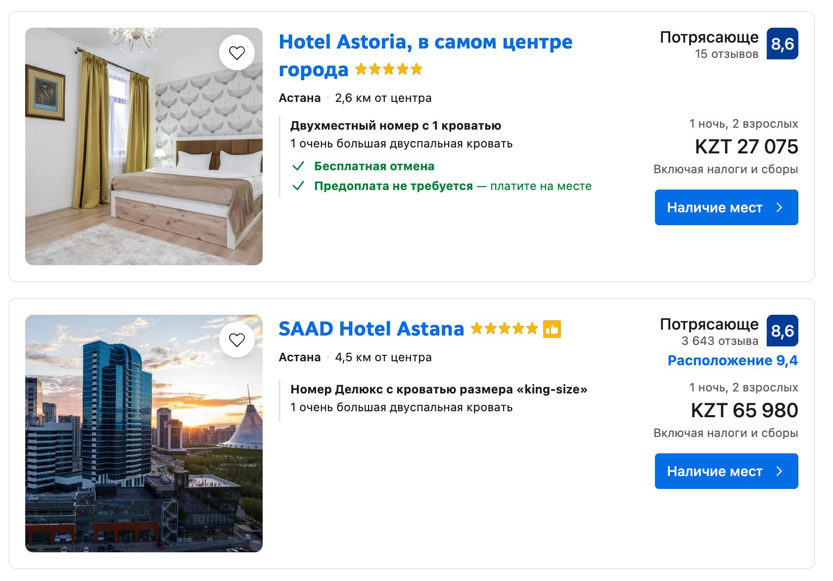 В Астане размещение обходится дешевле, но все равно заметно дороже, чем в Дубае. При похожих условиях номер на двоих стоит от 27 тыс. тенге за ночь.