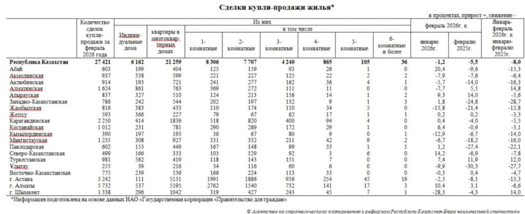В феврале 2026 года в Казахстане зарегистрирована 27 421 сделка купли-продажи жилья. По сравнению с январем показатель снизился на 1,2%, а в годовом выражении – на 5,5%, следует из данных Бюро Нацстатистики.