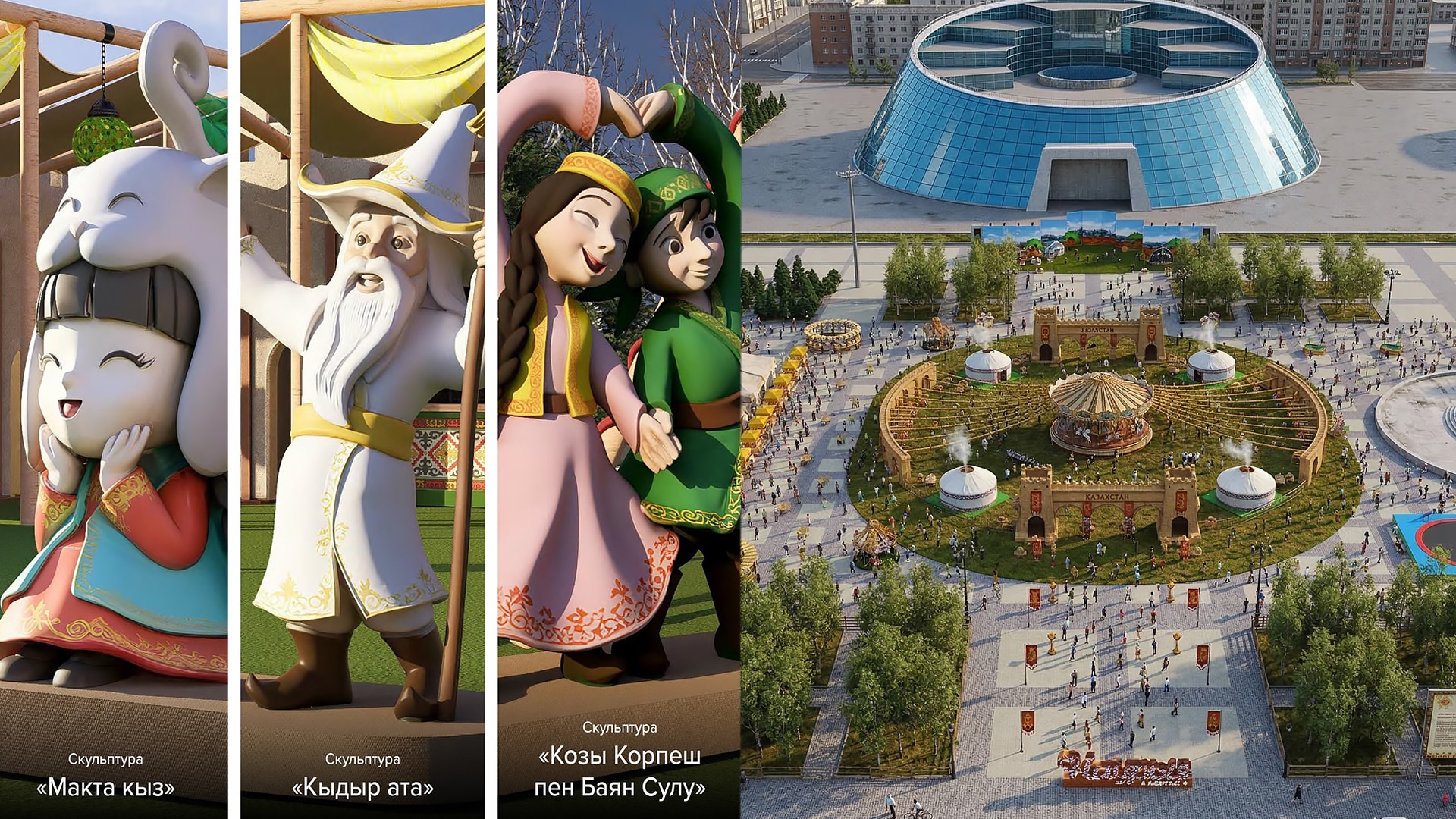 На территории возле «Астаны Арены» организуют восточный базар, установят юрты, торговые ряды и фотозоны. Среди арт-объектов фигуры персонажей казахских сказок и эпосов, включая «Макта кыз», «Кыдыр ата» и героев легенды «Козы Корпеш и Баян Сулу».