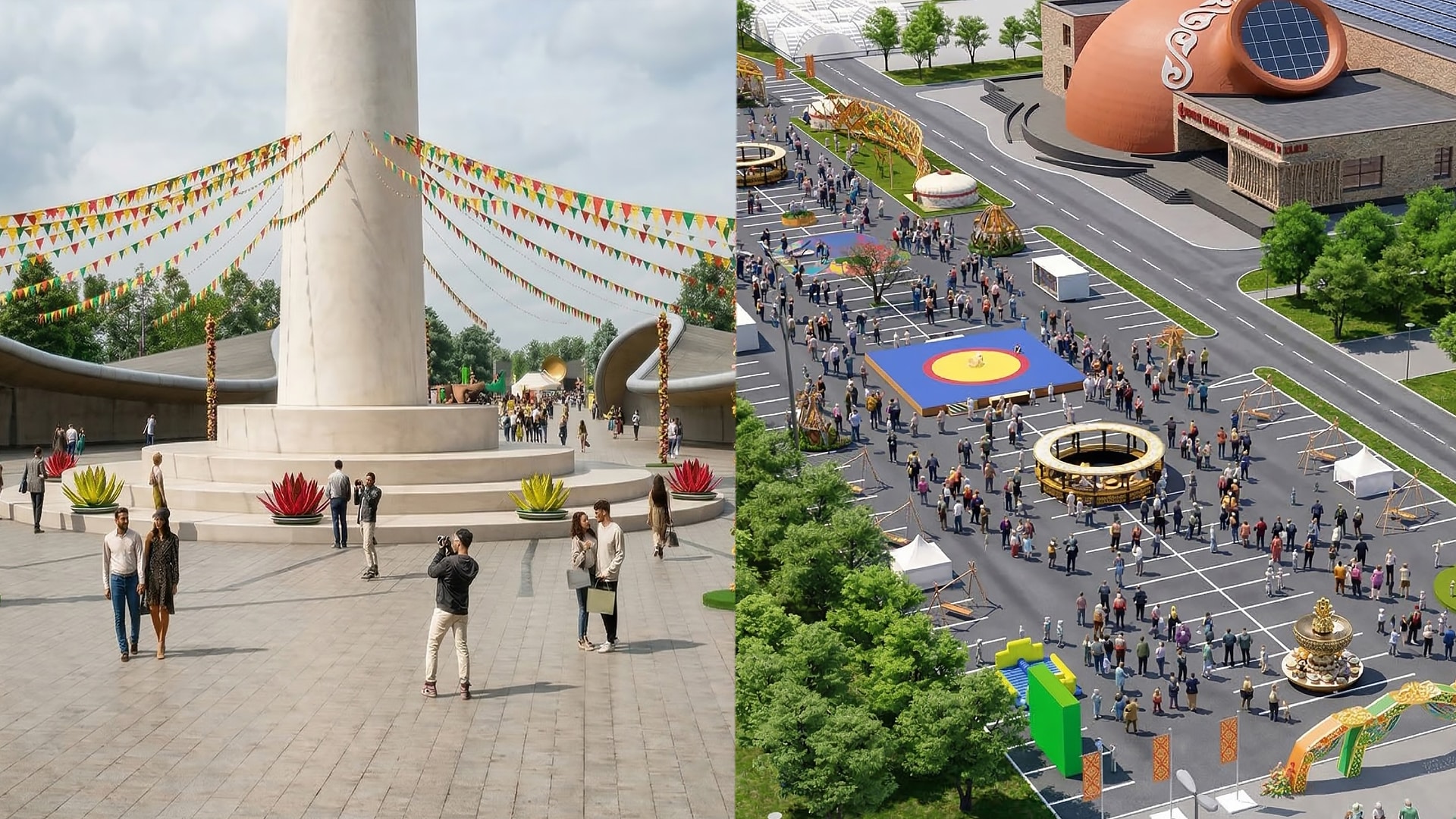 Одной из центральных площадок станет праздничная зона в районе EXPO. Там установят сцену для концертов, ярмарочные ряды, юрты и фотозоны. Также появятся тематические арт-объекты, включая фотозону «Ханский трон», инсталляцию «Кобыз» и другие декоративные конструкции.