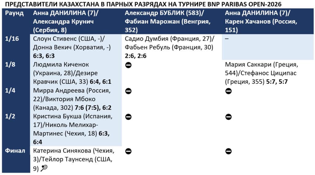 Лучшая наша парница Анна Данилина в Астане сыграет. Надежда на нее и на Юлию Путинцеву (76), в матчах за сборную играющую выше всяких похвал. А пока в дуэте с сербкой Крунич Данилина вышла в финал Индиан-Уэллса-2026. В поединке с испанкой Букшей и американкой Мелихан-Мартинес опытный казахстанско-сербский дуэт прибавлял в ключевые моменты. 5:2 – по брейкам, 65:43 – по всем розыгрышам и общий счет – 6:3, 6:4. Матч длился 1 час 18 минут.