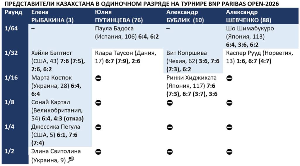 По итогам турнира в Калифорнии Рыбакина, уже побеждавшая здесь три года назад, судя по всему, обойдет Свентек в рейтинге WTA и впервые в биографии станет второй ракеткой мира. Именно борьбой за первое место в теннисной табели о рангах объясняется тот факт, что Елена, как стало известно накануне, не поможет сборной Казахстана в домашнем матче Кубка Билли Джин Кинг с Канадой (10-11 апреля).