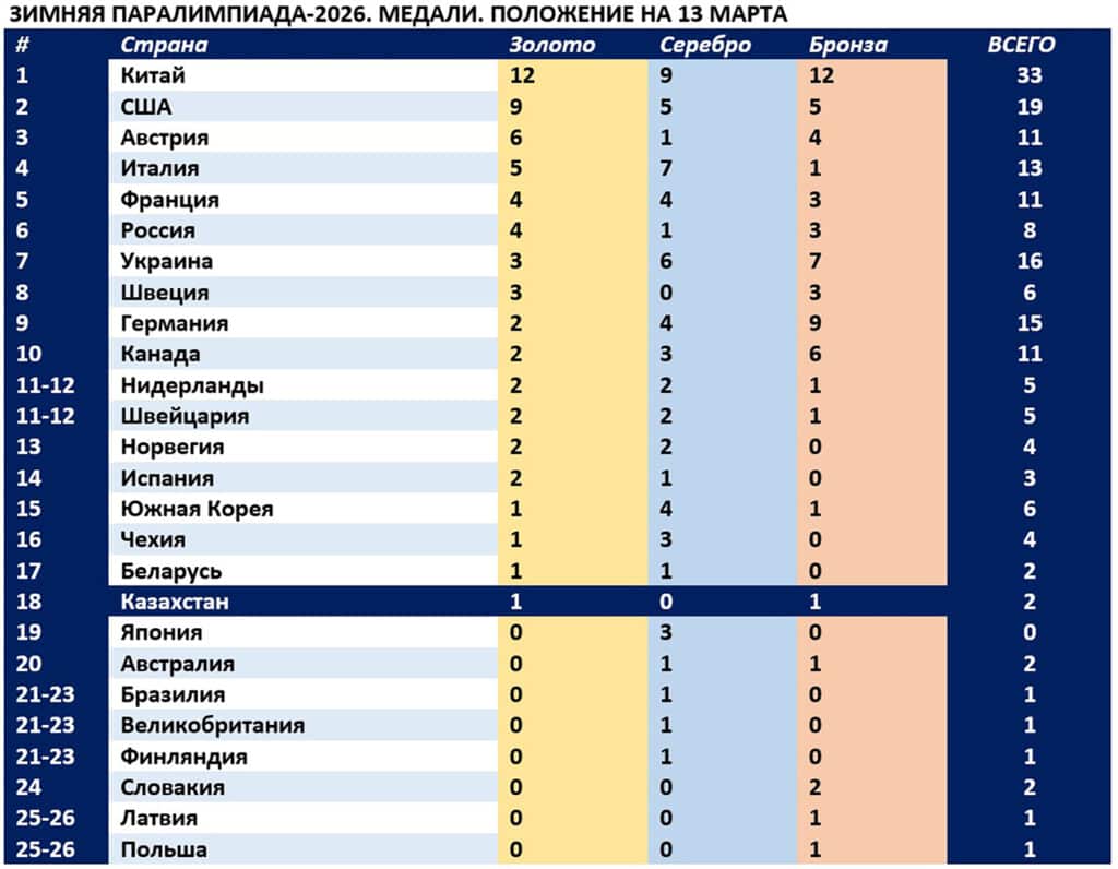 С золотой и бронзовой медалью Хамитова наша команда поднялась с 24-го места на 18-е. По одной медали высшей пробы также у Южной Кореи, Чехии и Беларуси. А больше всех наград (33) завоевала сборная Китая. Вторыми идут американцы, третьими австрийцы.