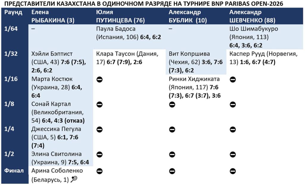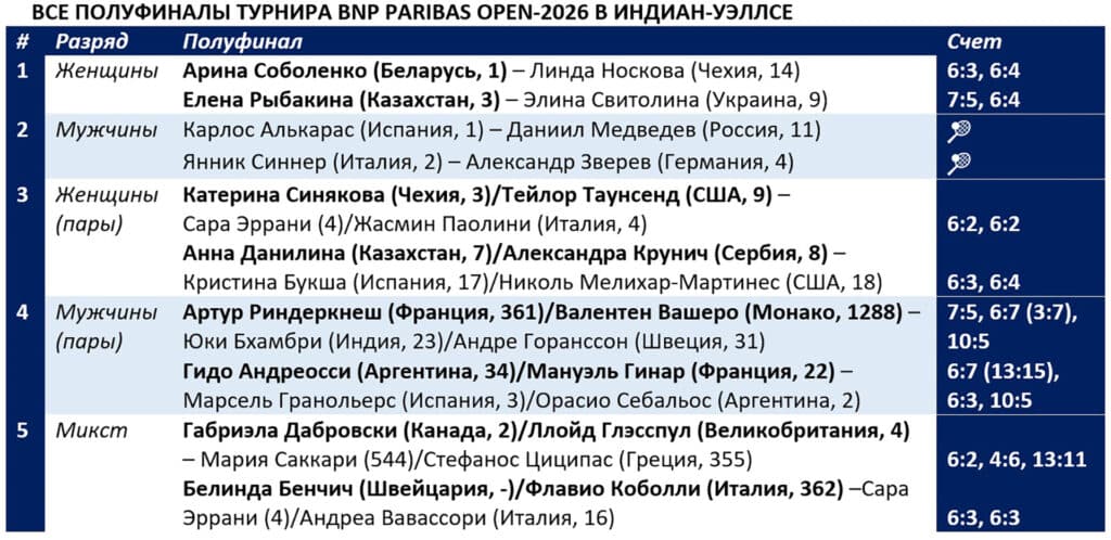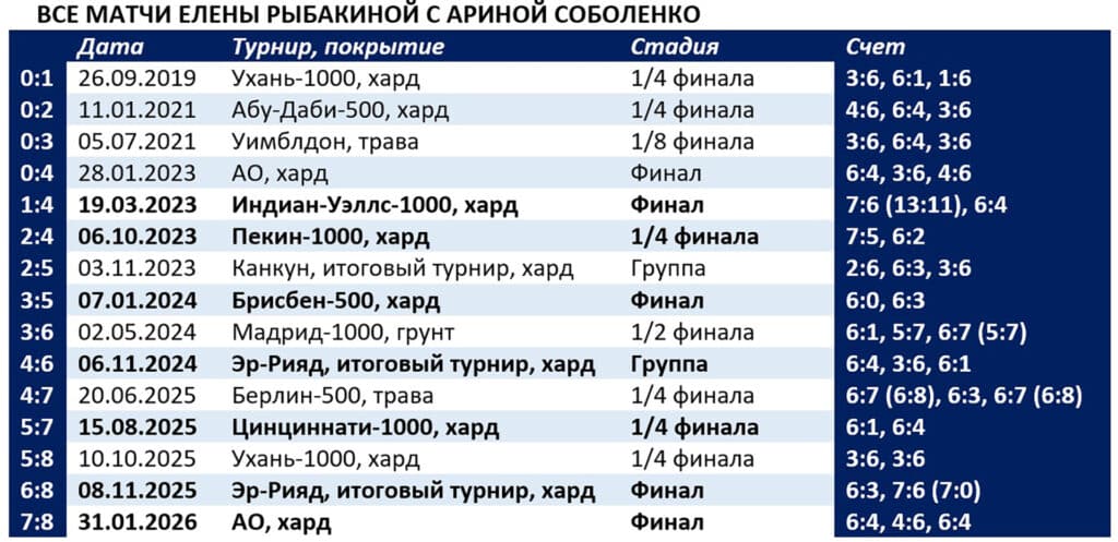 В финале Елену ждет новое противостояние с Соболенко. Третье за четыре месяца. На турнире года в Эр-Рияде и на АО-2026 Рыбакина у белоруски выиграла.