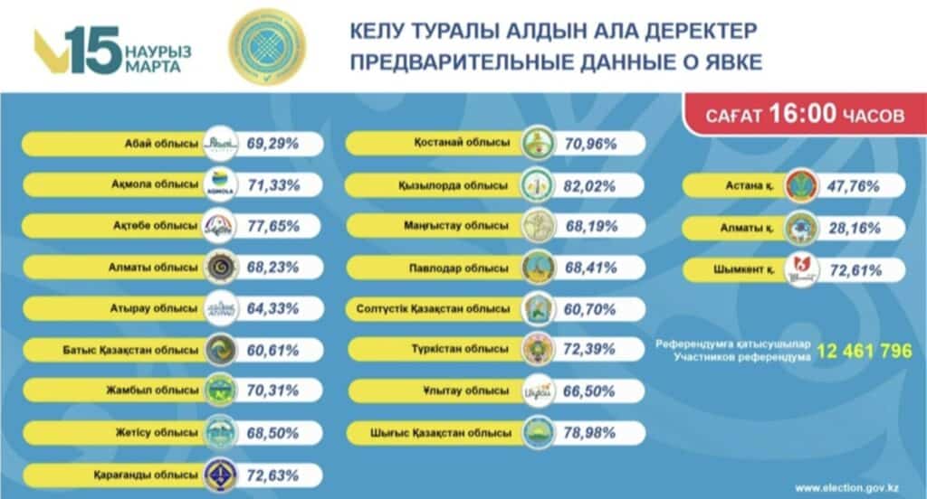 На 16:00 часов в референдуме приняли участие 8 029 286 казахстанцев. Об этом сообщила член ЦИК РК Асель Жанабилова.
