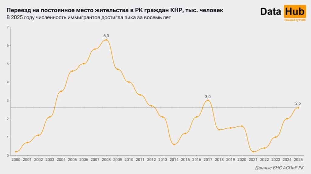 В Казахстане фиксируют рекордный за последние восемь лет приток иммигрантов из Китая. В 2025 году на постоянное место жительство (ПМЖ) из КНР прибыли 2,6 тыс. человек — это на 29% больше, чем годом ранее, сообщает telegram-канал DataHub со ссылкой на данные Бюро нацстатистики.