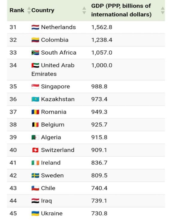 С показателем 973 млрд долларов Казахстан занимает 36-е место в мировом рейтинге. Страна расположилась между Сингапуром, экономика которого составляет около 988 млрд долларов, и Румынией с показателем 949 млрд долларов.