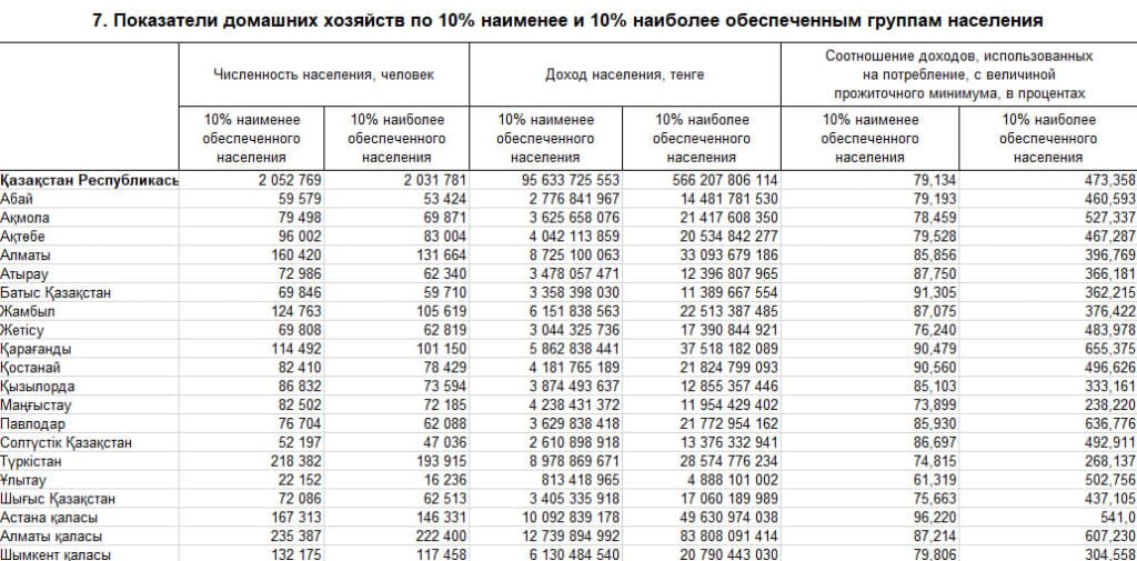 Всего в стране в 10% наименее обеспеченных входят 2,1 млн человек, а богатых – 2,03 млн человек. Общая сумма доходов обеспеченных – 566,2 млрд против 95,6 млрд тенге у наименее обеспеченных. Разница между суммами – почти в шесть раз.