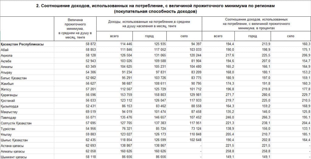 Вместе с тем покупательная способность в среднем в два раза выше прожиточного минимума. В среднем по стране доходы казахстанцев, направляемые на потребление, примерно в 2 раза превышают прожиточный минимум.