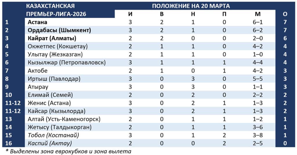 Обыграв в матче 3-го тура «Тобол» 2:0, «Астана» возглавила турнирную таблицу Казахстанской футбольной премьер-лиги-2026.