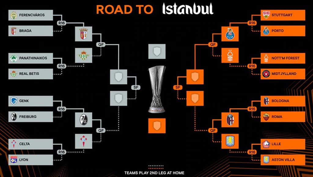 В топ-8 Лиги Европы вышли по два английских, испанских и португальских клуба. На стадии 1/8 финала сошли с дистанции французский «Лион» (4), проигравший «Сельте», немецкий «Штутгарт» (4), уступивший «Порту», итальянская «Рома» (6), не справившаяся с соотечественниками из «Болоньи». А также венгерский «Ференцварош» (2), греческий «Панатинаикос» (4), бельгийский «Генк» (7), датский «Мидтьюлланд» (2) и французский «Лилль» (5).