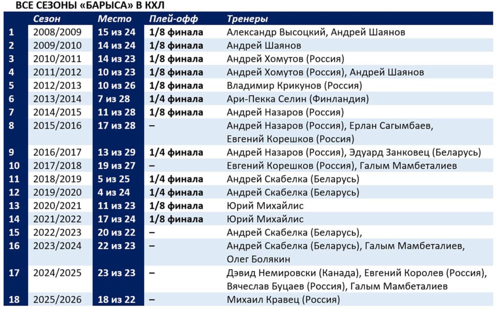 Прошедший сезон «Барыс» не может занести себе в актив. Астанчане, заняв предпоследнее место в Восточной конференции, четвертый год подряд осталась без Кубка Гагарина. Под руководством российского специалиста Михаила Кравца команду лихорадило весь чемпионат. Редкие победы сменялись затяжными сериями фиаско. Игре остро не хватало стабильности. В частности, «Барыс» по ходу сезона проиграл 15 матчей, в которых вел в счете.