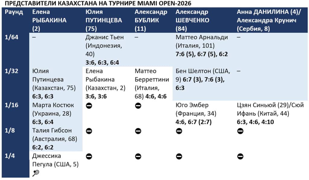 Рыбакина, единственной из представителей Казахстана добралась до четвертьфинала Майами. Александр Шевченко, Александр Бублик, Юлия Путинцева и Анна Данилина зачехлили ракетки ранее.