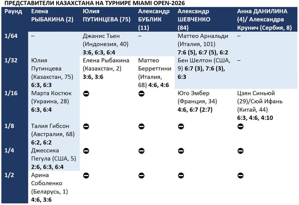 Рыбакина задержалась в Майами дольше всех других представителей Казахстана. Ранее из борьбы выбыли Александр Шевченко, Александр БубликЮлия Путинцева и Анна Данилина