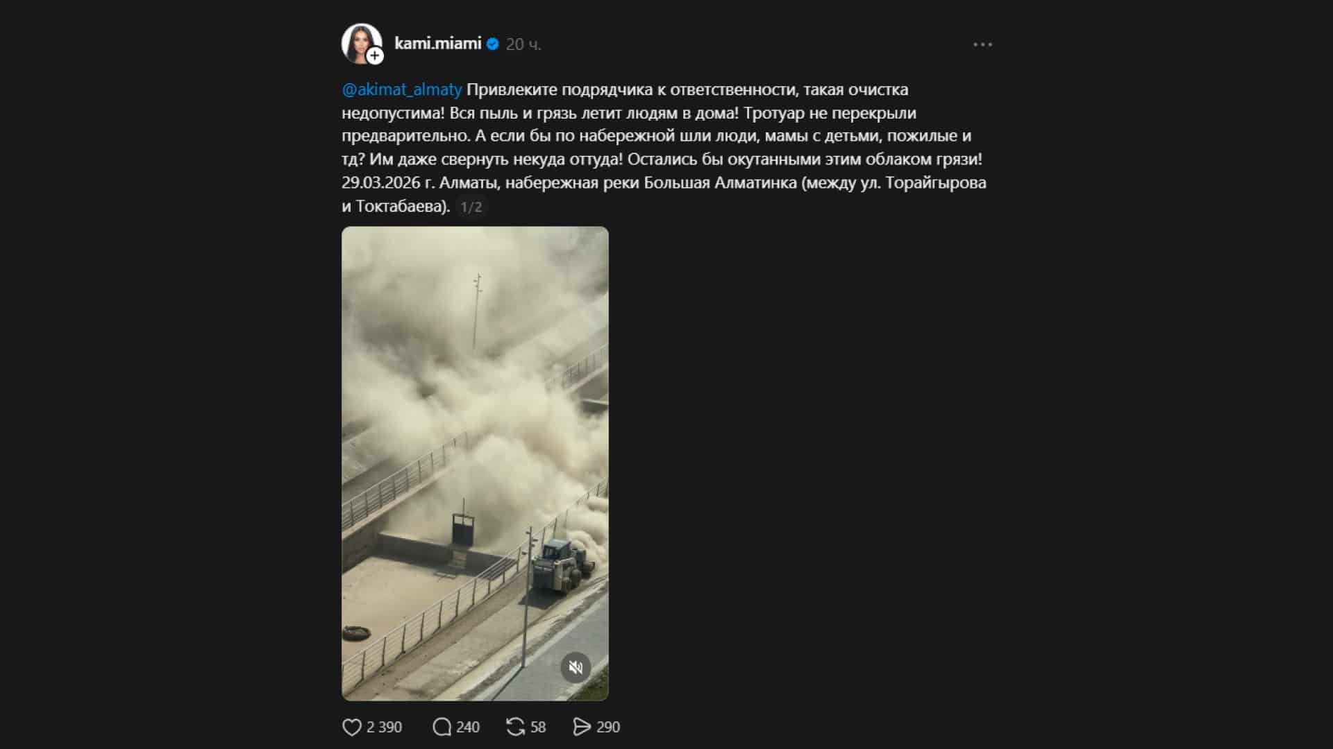 Жители Алматы возмутились методами очистки набережной реки Большая Алматинка. В социальных сетях распространились кадры, на которых спецтехника поднимает огромные облака строительной пыли, которая окутывает жилые дома и пешеходные зоны.