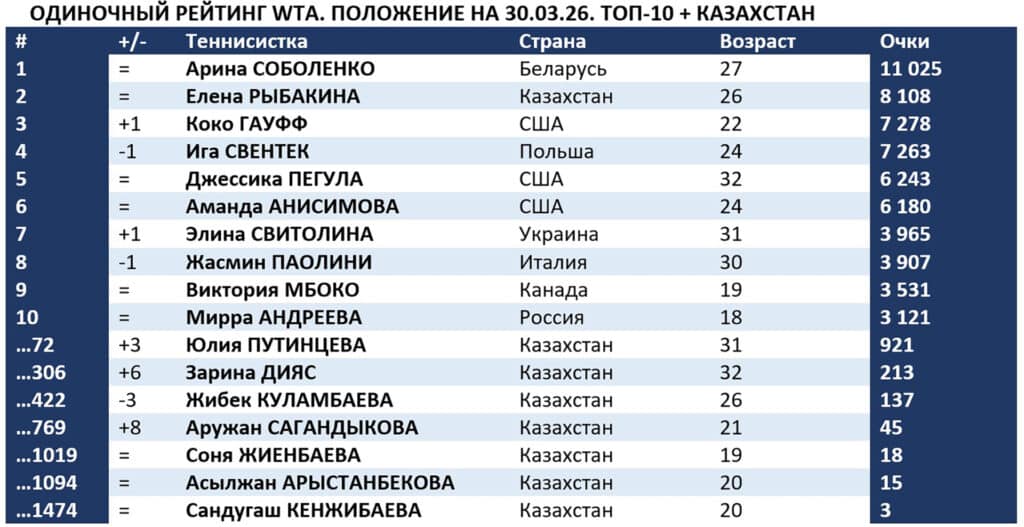 Казахстанка Елена Рыбакина, получив 390 очков за полуфинал турнира в Майами, упрочила свои позиции в качестве второй ракетки мира. Женская теннисная ассоциация (WTA) опубликовала очередной рейтинг-лист.