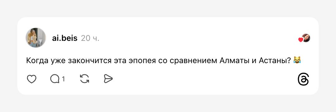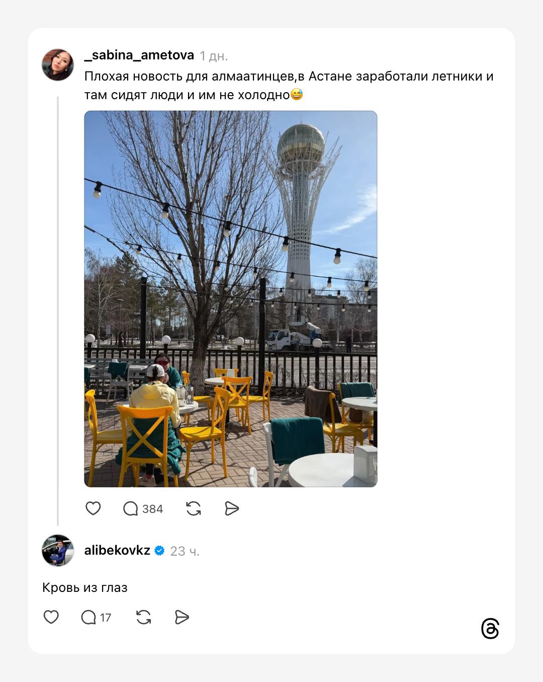 Причем жители столицы не упускают возможности ответить алматинцам на колкости по поводу ранних летников. В противовес образу «морозной и грустной Астаны» горожане активно радуются солнечной погоде.